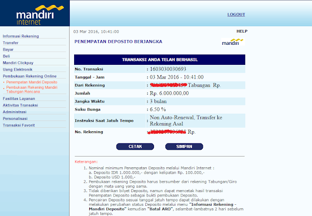 - pilih jangka waktu pencairan deposito saat jatuh tempo, 1 atau 3 bulan (via Ibanking mandiri).