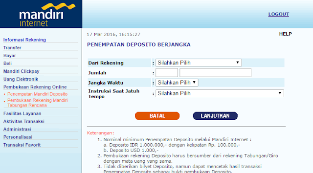 PENGUMUMAN!!! KARENA LAYANAN INTERNET BANKING MANDIRI SUDAH TIDAK BEROPERASI, MAKA DEPOSITO BISA DI BUAT DI MANDIRI ONLINE. CEK ARTIKEL TERBARUNYA >>> Cara Mudah Buka Deposito Via Mobile Banking Mandiri Online