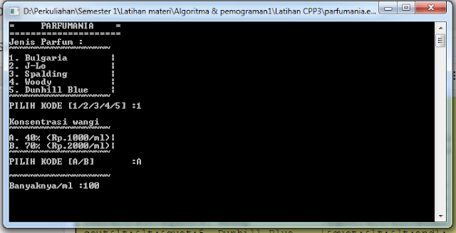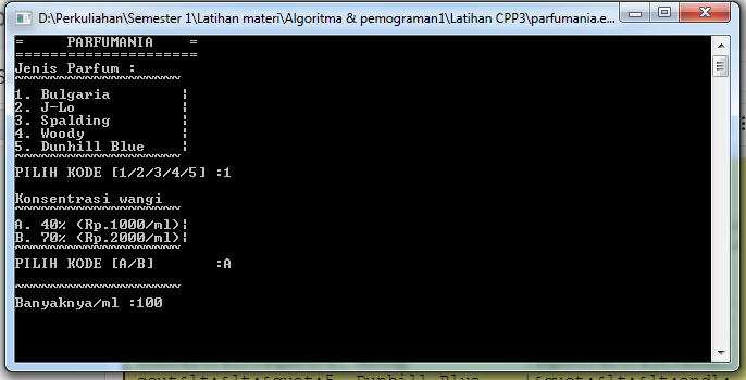 Contoh Program Aplikasi Penjualan (Parfum) Menggunakan Program Borland C++ ini adalah contoh tugas kelompok saya ketika memenuhi mata kuliah algoritma dan pemrograman. Program ini lumayan sedikit rumit dengan pilihan 3 variasi. Ketika membeli parfum, pembeli mengharuskan memilih merk parfum, banyaknya (dalam ml) dan konsentrasi wanginya.
