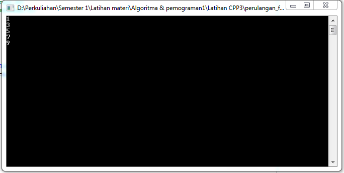 Berikut ini adalah logika perulangan FOR pada program C++, Dimana saya akan mengulang angka setelah angka 1 yang ditambahkan 2 secara terus menerus dengan maksimal angka adalah 10.