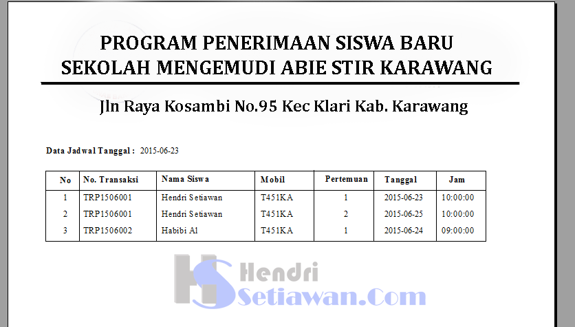 Selanjutnya Kita lihat Contoh Laporan Data Biaya Program Penerimaan Siswa Baru Sekolah Mengemudi dengan menggunakan bentuk laporan Crystal Report 8.5