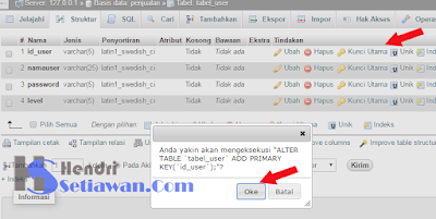 8. Lihat Penjualan>Tabel_user>struktur. Pilih primarykey(kunci utama) yang mewakili sebuah tabel, misalnya id_user, dan klik OKe