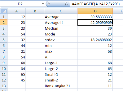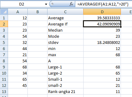 Jawab : =Averageif(A1:A12,">20") , maka jawabannya adalah 42,09