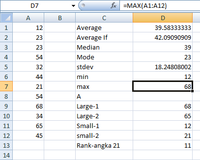 Jawab : Max(A1:A12) maka hasilnya adalah 68