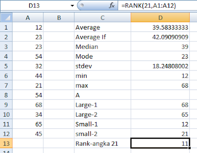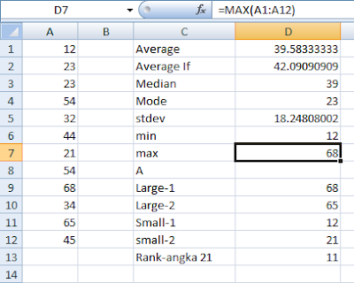 Jawab : =Large(A1:A12,1) maka hasil nilai paling tinggi pertma adalah 68, dan nilai tinggi kedua adalah =Large(A1:A12,2) hasilnya 65