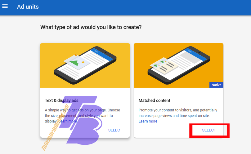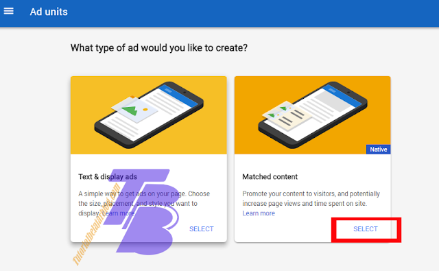 3. Pilih Matched Content, jika anda tidak melihat Matched Content artinya blog anda belum dapat di pasang iklan ini (biasanya konten kurang memadai, trafik masih rendah)