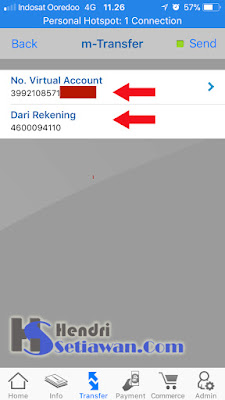4. Masukkan Nomor virtual account 39921+nomor handphone yang sudah terdaftar di M-Tix, misalnya 39921085712345678. Kemudian pilih No.Rek dan klik SEND