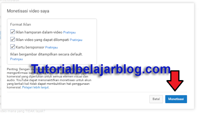 8. Pilih Monetisasi Video untuk memberikan Iklan pada video kamu di youtube.