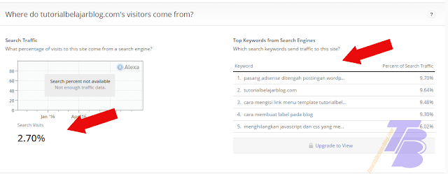 Search Traffic adalah trafik pencarian konten blog yang dihitung dalam persentase, misalnya pengunjung mencari cara membuat blog di search engine, pada 100 pengunjung yang mencari hanya 15 orang yang masuk ke blog kita. Maka persentasenya adalah 15% saja, namun pada alexa persentase yang digunakan adalah jumlah pencarian yang masuk berdasarkan url blog. Blog tutorialbelajarblog.com memiliki Search traffic 2.70%, artinya 1000 orang mencari infomasi di search engine hanya sekitar 27 orang yang masuk ke blog tutorialbelajarblog.com. Semakin tinggi persentase maka semakin bagus.