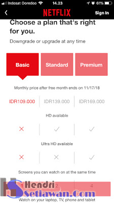Terdapat bermacam-macam plan streaming di Netflix, mulai dari yang Rp109K, Rp139K dan Rp169K untuk setiap bulannya, semakin mahal maka semakin bagus kualitas gambarnya.
