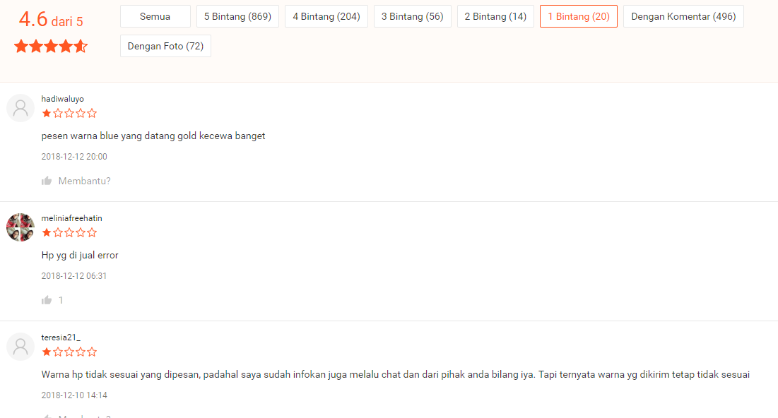3. Berikut ini contoh dari penjual yang lain, pembelinya lumayan banyak namun terdapat feedback negatif pada 1 bintang, setelah saya lihat testimoni pembeli kebanyakan kecewa dan pastinya saya tidak akan membeli hp disini