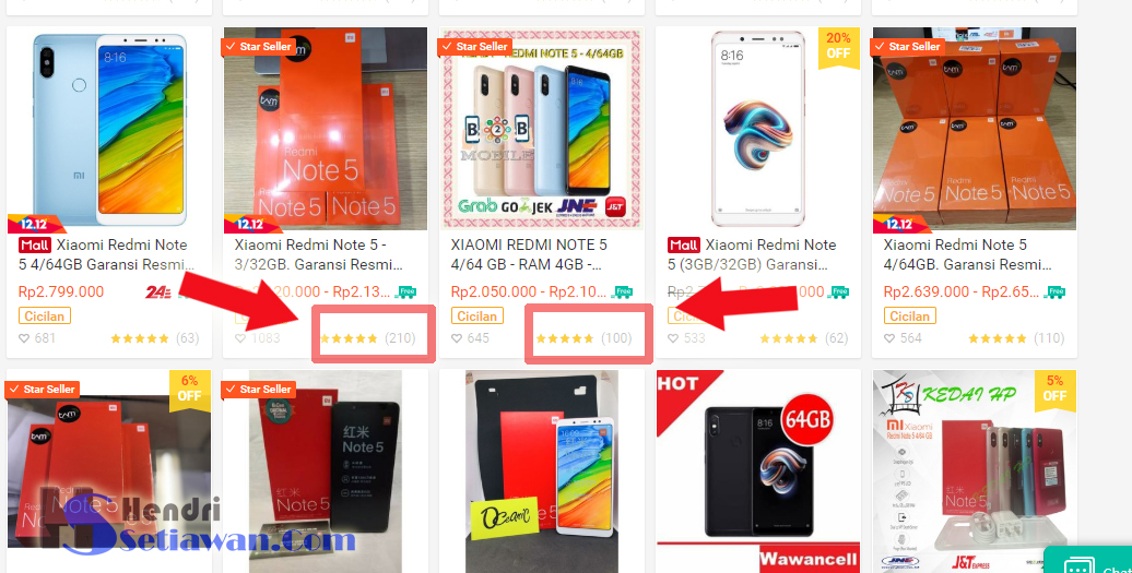 1. ketik merk smartphone beserta tipenya, centang pada filter "Terlaris" atau juga bisa "Star Seller", mengapa begitu? karena star seller biasanya memiliki riwayat pembeli banyak. Misalnya dibawah ini saya pilih 2 penjual teratas dengan jumlah feedback paling banyak dan bintang 5. Saya cek satu-satu dan ternyata saya lebih memilih yang feedbacknya 210