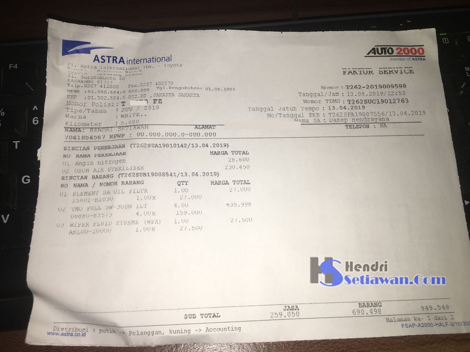 Total Biaya keseluruhan adalah Rp949.548 (sudah termasuk PPN10%). Untuk oli sendiri saya lebih memilih Oli sintetik (Syntetic Oil), hal ini karena oli sintetik lebih bagus dibandingkan oli biasa (oli mineral), oli sintetik lebih mendinginkan mesin lebih cepat juga lebih awet masa pakainya, misalnya jika oli mineral masa pakainya hanya 6 bulan, maka oli sintetik bisa digunakan hingga 7 bulan, walaupun dari segi harga memang lebih mahal oli sintetik. Jadi jika mobil anda adalah tipe terbaru (All new), biasanya mesin pun adalah versi terbaru, yang mana akan lebih cocok menggunakan oli sintetik.